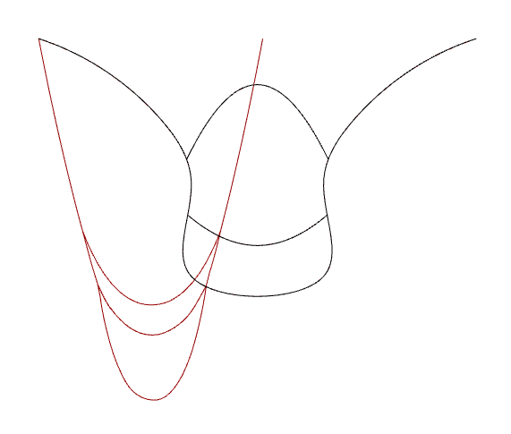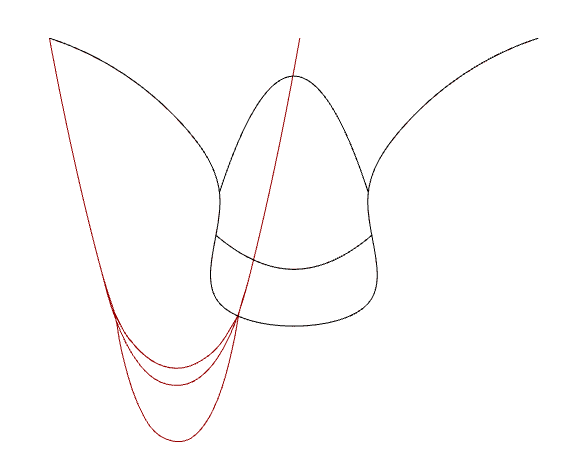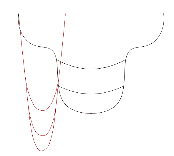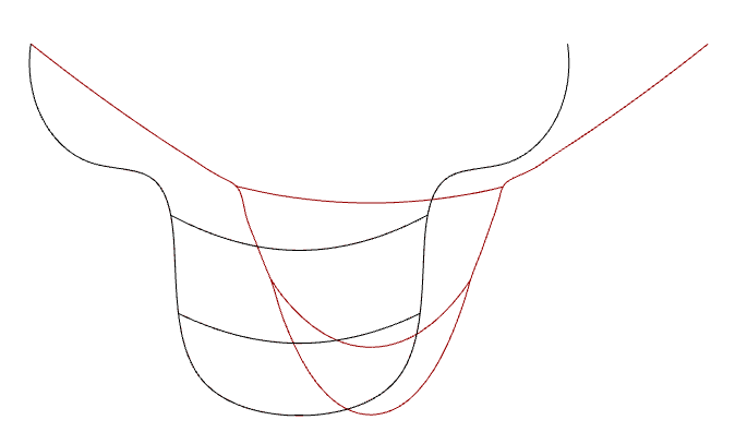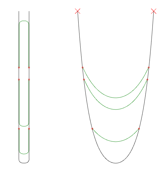 The photos below demonstrate the performance of the first script in the grasshopper/rhino interface. An initial profile is created to represent the desirable form of the formwork (shown in black). The results of the script are shown in red, and reveal what the actual form will look like once it is removed from the knitting machine and opened at varying distances. How far the formwork can open will be dependent on the length of the fins. This script can also be used to determine if the fins will overlap while being knit and the design is therefore not feasible.
