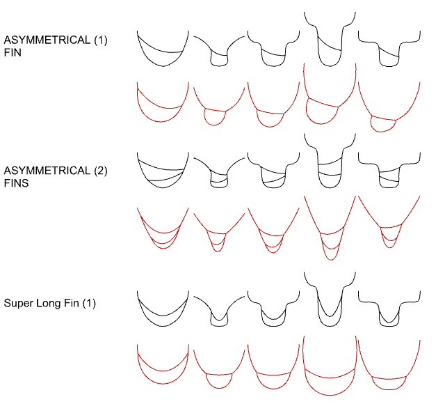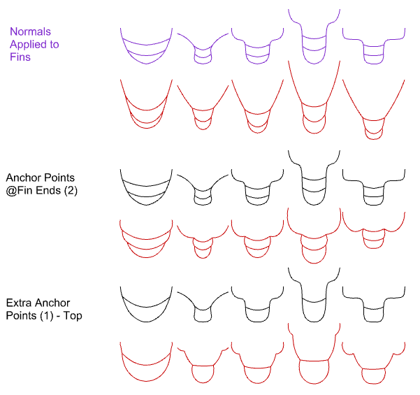 The fabric formwork is knitted vertically to become the shape on the right before concrete is poured. While being knitted, fins cannot overlap, but fins can have holes in it and/or be knitted upside-down.