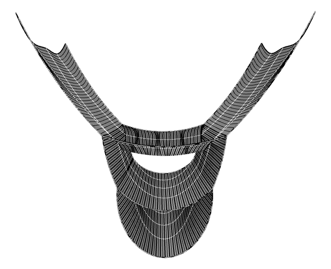 This project was computational, with use of Grasshopper, Rhino, and Python. Two scripts were produced from this project. The first script determines shape of the fabric formwork after being knitted. The second script determines the form after concrete is applied, taking into account both hydrostatic and gravitational force.